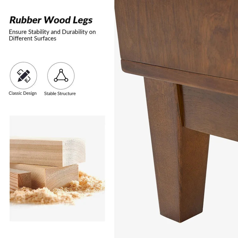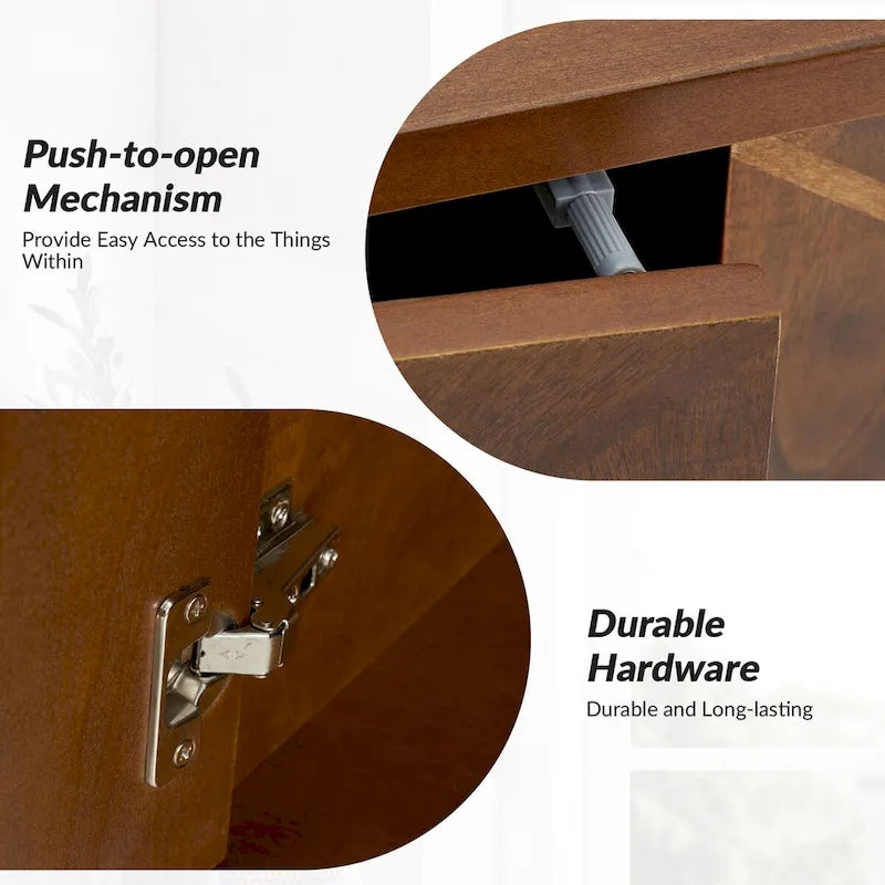 Mid-century sideboard with geometric diamond patterns on doors. Features push-to-open magnetic doors and adjustable interior shelves. Full paint finish with solid rubberwood legs.